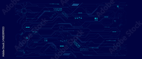 AI circuit board background with chip, wires, and circuit components. Technology lines circuit and dots on blue background,