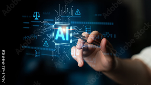 AI circuit microchip with glowing blue lines, surrounded by legal scales, warning symbols, data sheets, and binary codes, representing ethical AI, AI governance, and data integrity Latch