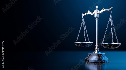 AI cyber legal concepts are depicted through digital fractals shaped like scales of justice, glowing with a purple light.