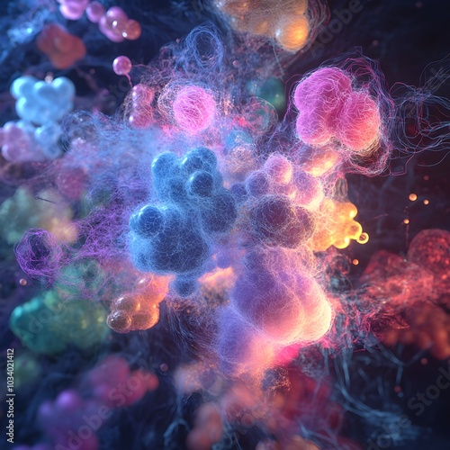 AI driven analysis of millions of chemical compounds visualized as swirling colorful data clouds forming and breaking apart