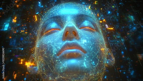 AI entity emerging from a cosmic digital realm, surrounded by luminous circuits and neural network tendrils, abstract data streams in a futuristic holographic setup