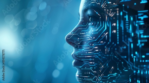 AI Face with Digital Circuit Patterns and Blue Bokeh Background