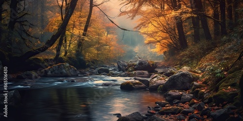 AI Generated. AI Generative. Autumn fall forest park countryside nature adventure outdoor forest with river stream watercolor drawing background. Graphic Art