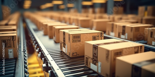 AI Generated. AI Generative. Factory shipping cargo delivery factory conveyor belt with many cartoon box moving. Graphic Art