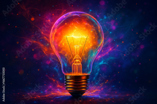 AI generated conceptual art of a glowing light bulb radiating golden light surrounded by colorful cosmic energy symbolizing creativity imagination and inspiration