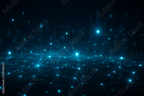 AI generated digital abstract network of glowing blue data nodes and geometric lines in a dark virtual space representing futuristic connectivity and real-time information processing
