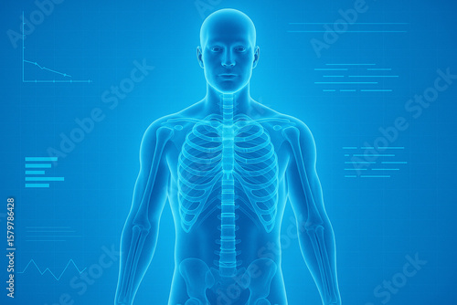AI generated digital male body scan with glowing transparent skeletal system and blue medical data graphics in a clean futuristic diagnostic interface
