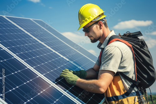 AI generated engineer man working with solar panels wind power turbines against blue sky background