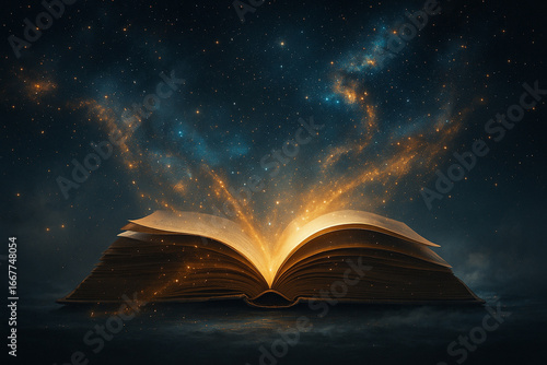 AI generated fantasy artwork of an open book radiating golden light with cosmic stars and mystical energy symbolizing endless knowledge and imagination