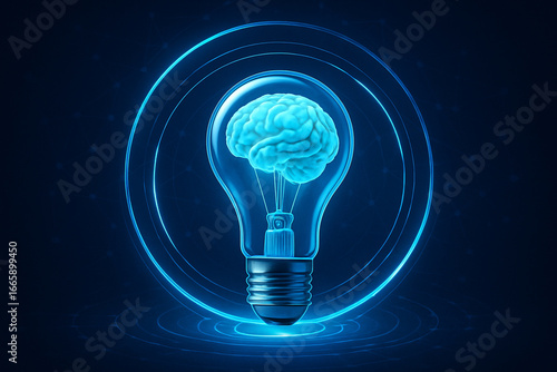 AI generated glowing lightbulb with human brain inside surrounded by blue energy rings symbolizing knowledge creativity technology and innovation in a futuristic digital concept