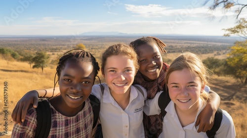AI generated illustration of a group of four diverse friends embracing in a deserted landscape