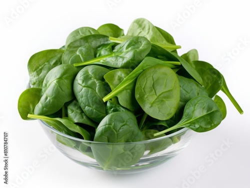 AI generated illustration of spinach leaves in a clear glass bowl on a white background