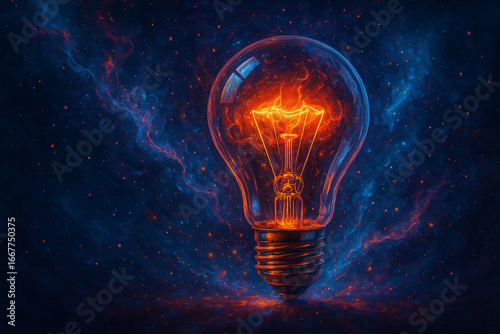 AI generated ultra realistic artwork of glowing light bulb with fiery orange red flame inside surrounded by blue and purple cosmic particles symbolizing imagination creativity inspiration and energy