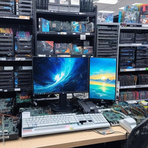 AI Generative image of Office desk setup with dual monitors and circuit boards on shelves in the background