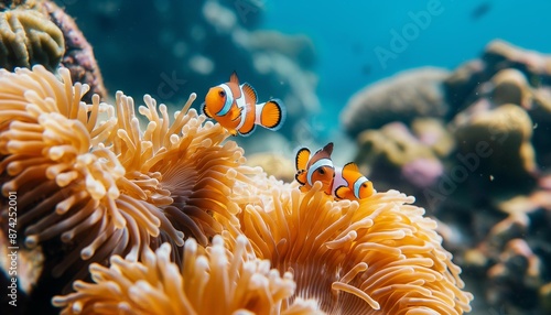 AI generator image of Nemo fish, several clown fish, are swimming on coral and white anemones. The blue sea water is clear and clean.deep blue sea