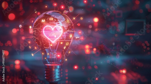 Ai light bulb with various neon icons representing business and technology around it, such as a love symbol in the center of the icon, and an electronic chip inside