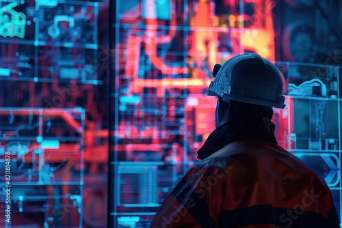 AI monitoring a construction site, displaying realtime data, Tech, Neon, Digital Art