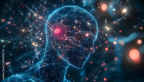 AI on a futuristic humanoid with glowing network connections, concepts of digital artificial intelligence, technological and innovative business, data science and cybernetics.