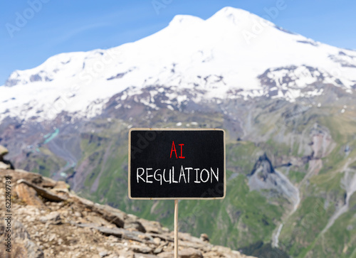 AI regulation symbol. Concept words AI artificial intelligence regulation on blackboard. Beautiful mountain Elbrus background. Business AI artificial intelligence regulation concept. Copy space