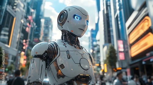 AI robot casually walking alongside humans in a high-tech urban plaza, towering skyscrapers with neon accents in the background, soft reflections on its metallic surface,