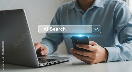 Ai Search on Mobile Device Using Laptop for Task, Modern Technology Integration for Work and Online Research