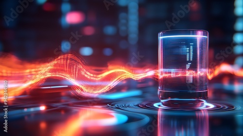 AI soundwaves intertwined with a voice assistant, highlighted by ultra-modern technology and futuristic cityscapes in the background