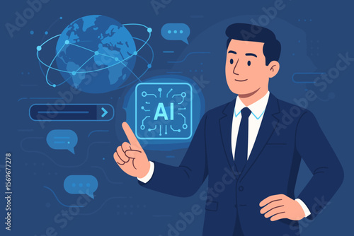AI technology concept. Businessman interacts with virtual graphic of global internet connection. Chat with AI, Artificial Intelligence, generative AI. Futuristic interface.