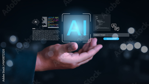 AI technology interface with data visualization, coding, and digital command prompt over human hand, symbolizing innovation, automation, and artificial intelligence solutions.