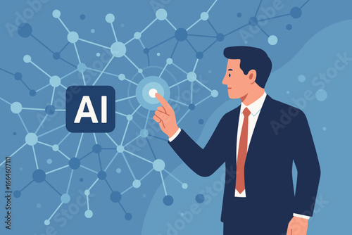 AI technology, machine learning concept. Businessman touching big data network connection. Data exchange, deep learning innovation. Business automation in a futuristic new era.