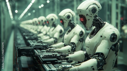 AI-driven automated manufacturing systems creating complex products: Robots working in sync in a fully automated production line.