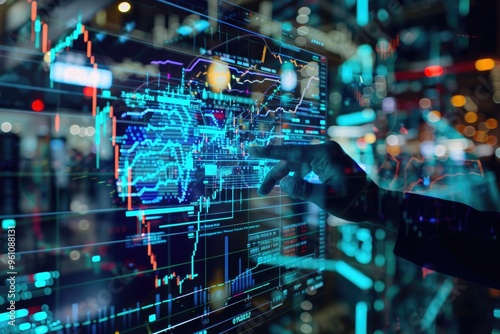AI-driven stock market analysis on a holographic interface, showcasing advanced financial tools and real-time data
