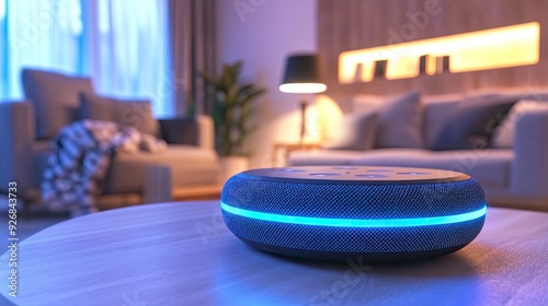 AI-driven voice assistant, responding to commands, on a smart speaker, modern living room, soft ambient light