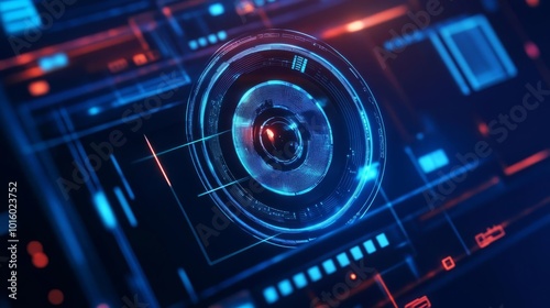 AI-enhanced security systems, holographic surveillance, modern smart city