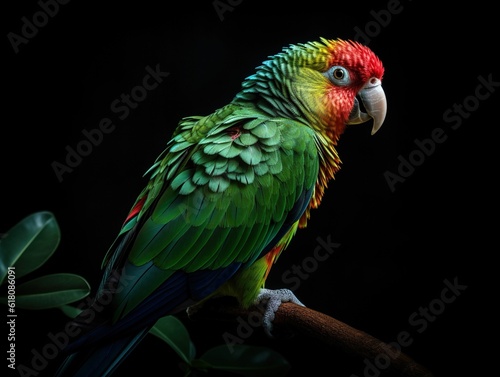 AI-generated illustration of a parrot with striking red and green plumage perched on a branch.