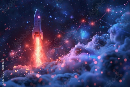AI-generated image, line graph showing skyrocketing sales growth. Become a rocket ship soaring through the starry sky. The picture symbolizes the potential of effective sales performance management.