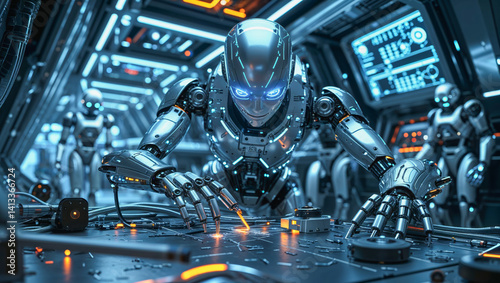 AI-generated images of a cybertronic humanoid robot working on an intergalactic spaceship