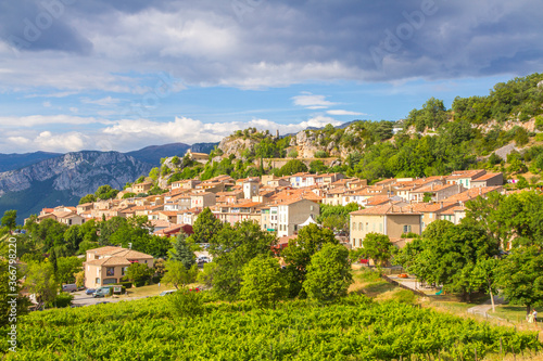 Aiguines village next to Verdon Gorge (Gorges du Verdon) in the Provence-Alpes-Côte d'Azur region in southeastern France.