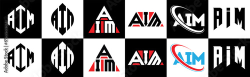 AIM letter logo design in six style. AIM polygon, circle, triangle, hexagon, flat and simple style with black and white color variation letter logo set in one artboard. AIM minimalist and classic logo