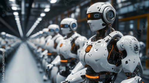AI-powered robots managing work in a factory. A humanoid robot with artificial intelligence (AI) controls robotic arms within a manufacturing environment. This represents Industry 4.0, where AI techno