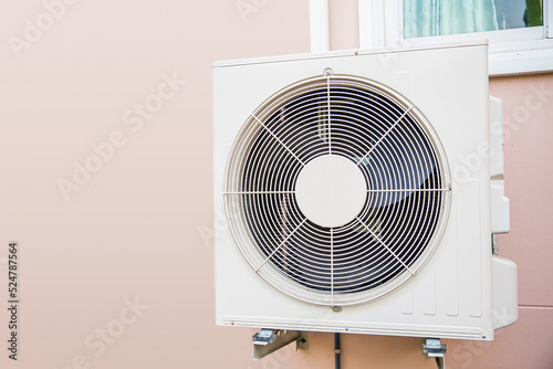 Air compressor, Close-up external split wall type of outdoor air conditioner compressor unit installed on outside building. Concepts of heater or heat and air conditioning system maintenance.