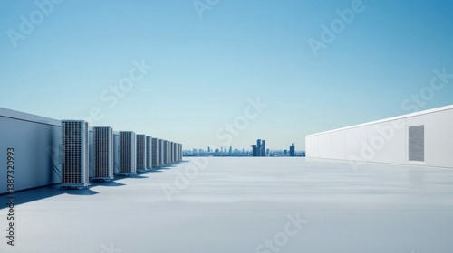 Air conditioning units on a rooftop, with a city skyline visible in the background under a clear sky.