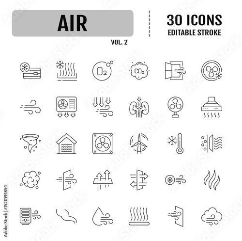 Air line editable icon set. Containing ventilation, air conditioner, fan, wind, blow, oxygen, breathe, CO2, pollution and more. Vector illustration