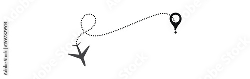 air plane flight route with start point and dash line trace. Various aircraft and destination location pins icons. Aircraft tracking, planes, travel, map
