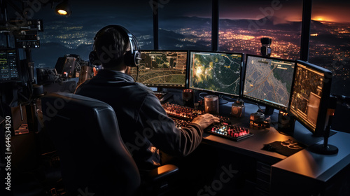 Air traffic controller worker. Office room with navigation screens,airplane departure and arrival data team. Airport tower concept.