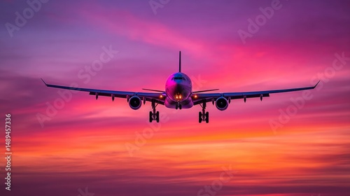 Airplane Approaching Landing at Sunset with Vibrant Colors in Sky Over Airport with Pink and Purple Cloud Formation