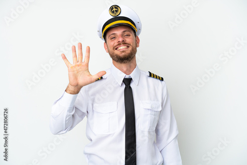 Airplane Brazilian pilot isolated on white background counting five with fingers
