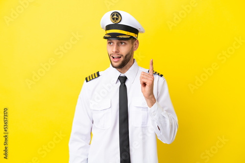 Airplane caucasian pilot isolated on yellow background thinking an idea pointing the finger up