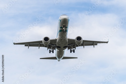 Airplane flying overhead on a clear day with a backdrop of blue skies and scattered clouds
