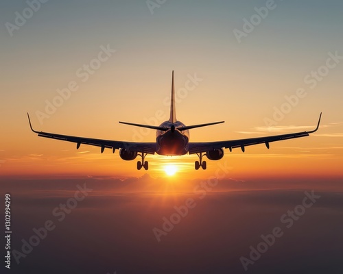 Airplane framed by a golden sunburst, soaring through the ethereal colors of dawn