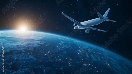 airplane in motion around a blue planet Earth, representing the journey of international travel, global airline routes, and exploring the world. Suitable for promoting global touri